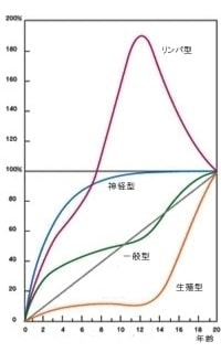 このグラフは、1930年にミネソタ大学のスキャモン教授が発表した「人体計測」という本の一節「子どもの身体計測」に載っている図です。