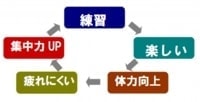 「走り」は全ての運動の基本です。「正しい走りの練習を繰り返しする」→「いろんな運動ができるようになって運動が楽しくなる」→「普段から身体を動かすことが楽しくなるので体力がアップする」→「自然と体力がつくので疲れにくくなる」→「普段から集中力が向上する」という、良い循環がうまれます。